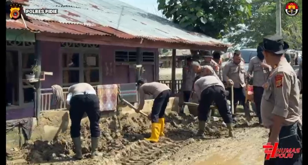 Di lokasi, alat berat tampak bekerja mengangkat material lumpur sisa banjir dan memindahkannya ke dump truck, sementara personel Polres Pidie bersama masyarakat melakukan pembersihan secara manual menggunakan peralatan sederhana. Upaya ini dilakukan guna menormalkan kembali akses jalan yang sebelumnya sulit dilalui akibat endapan lumpur tebal.