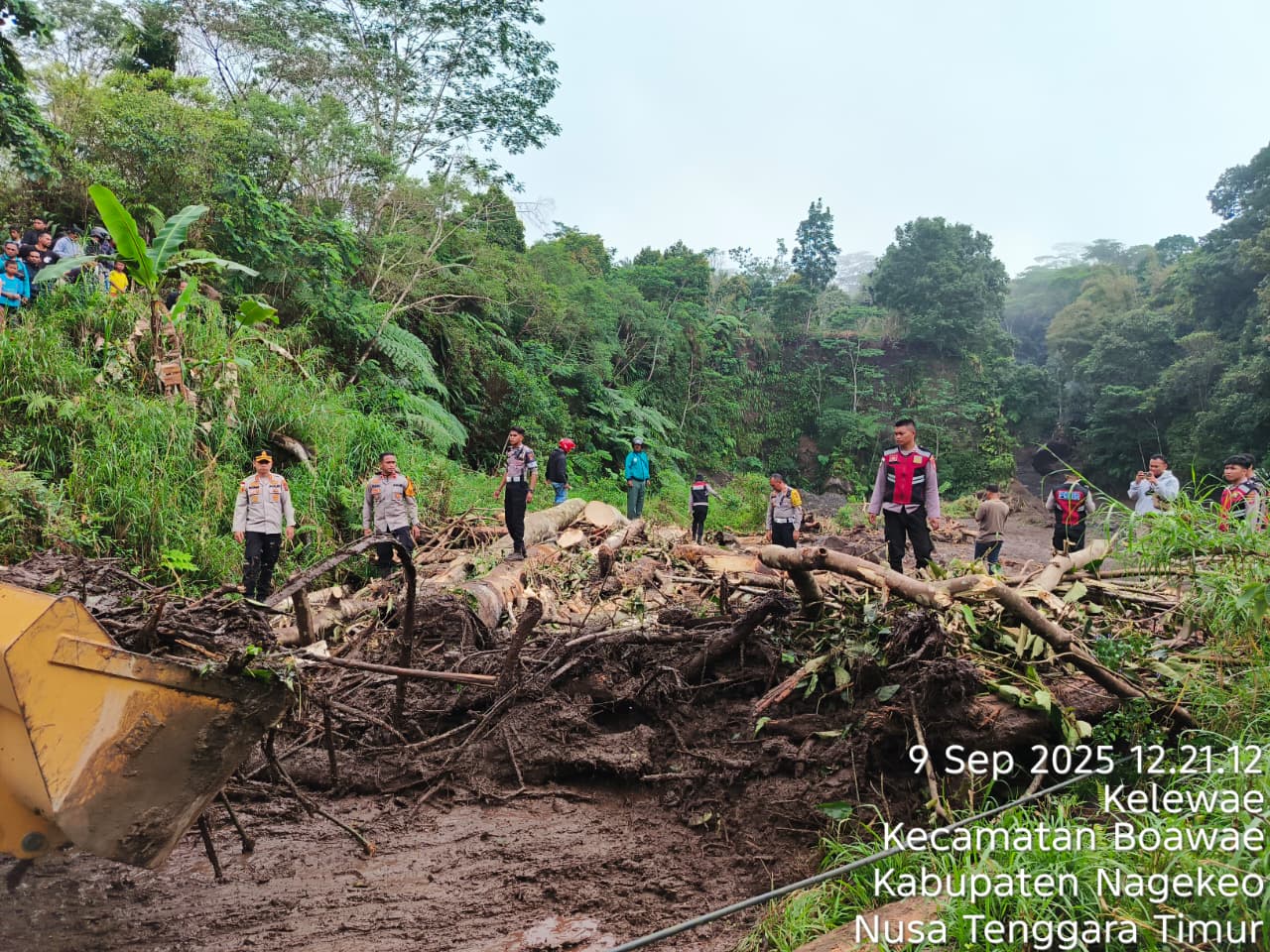 Nagekeo – Memasuki hari ketiga pasca bencana banjir bandang yang melanda Kecamatan Mauponggo, Polres Nagekeo di bawah pimpinan AKBP Rachmat Muchamad Salihi, S.I.K., M.H., terus memperkuat sinergi dengan berbagai pihak dalam penanganan darurat bencana. Pada Kamis (11/9/2025) pukul 10.00 WITA, tim gabungan yang terdiri dari warga, personel TNI Batalyon TP 834 WM, dan unsur terkait berhasil menemukan jenazah seorang anak di belakang Kantor Desa Sawu. Jenazah tersebut telah teridentifikasi sebagai Archiles Agustinus Busa Jago (1,2 tahun) dari Desa Sawu dan telah diserahkan secara resmi kepada keluarga untuk dimakamkan.